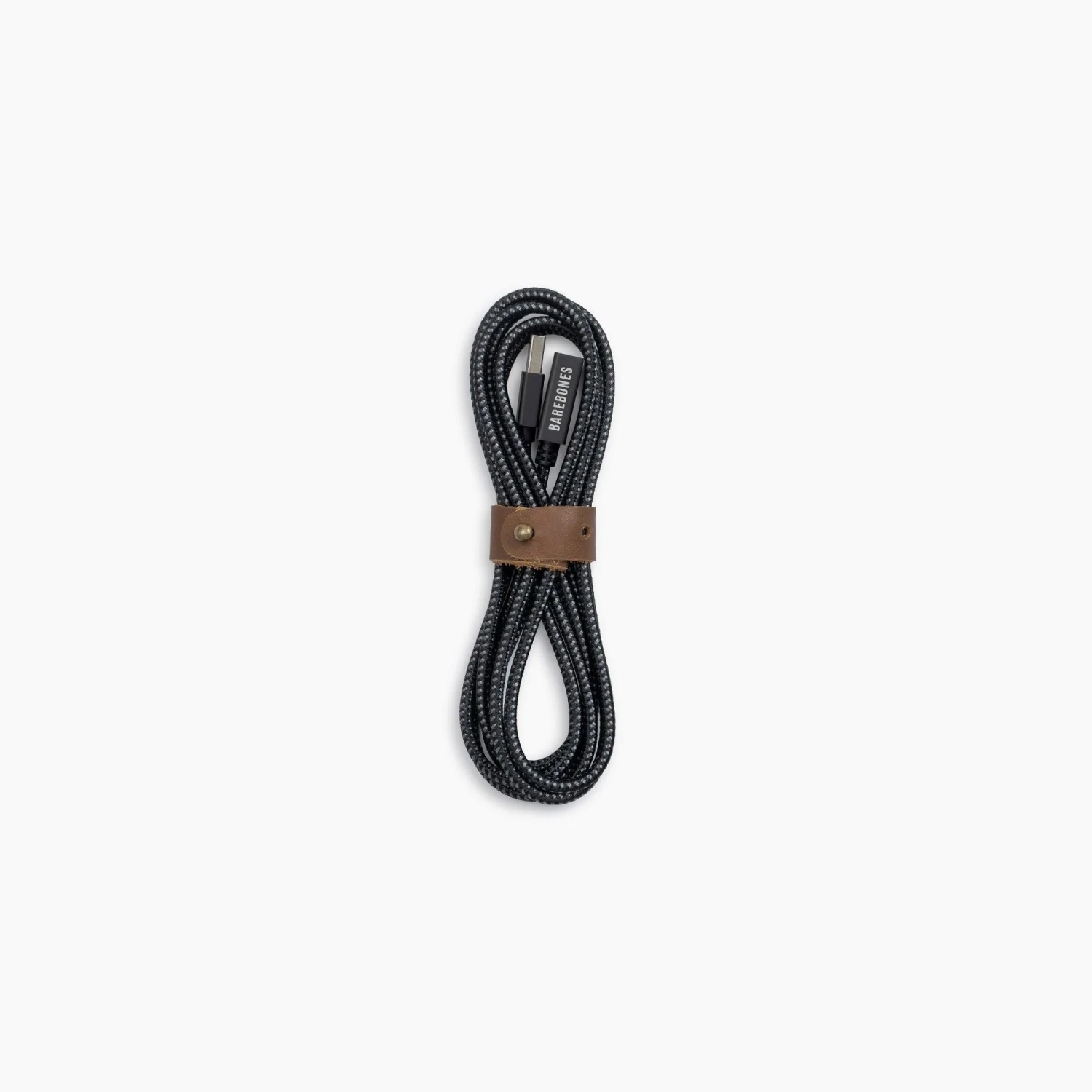 Two meter extension cord features universal USB charging port for use with Barebones rechargeable lights. Durable leather holding strap features copper rivet for neat and compact storage. Modern black design seamlessly blends into the background so you can enjoy your experience undistracted.
