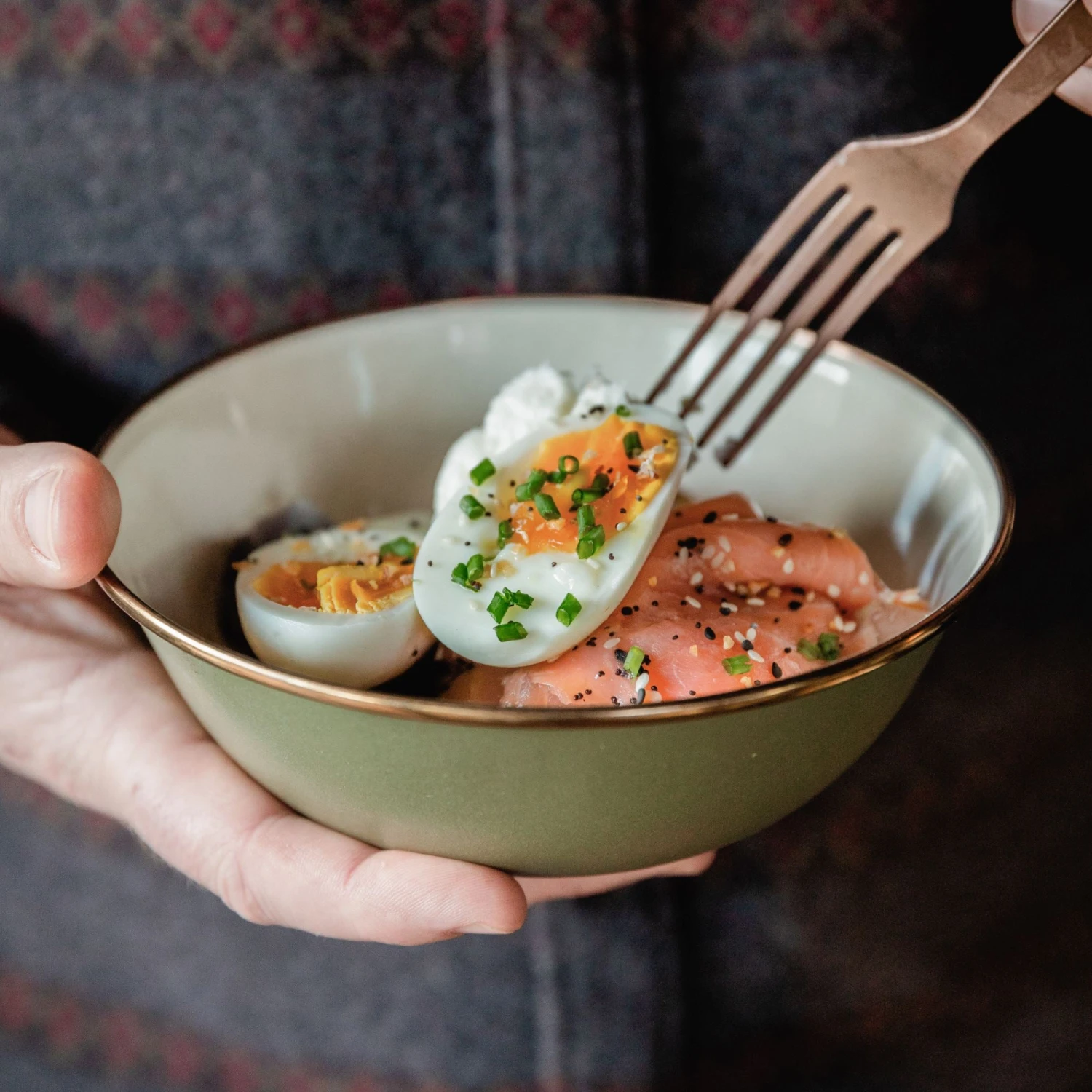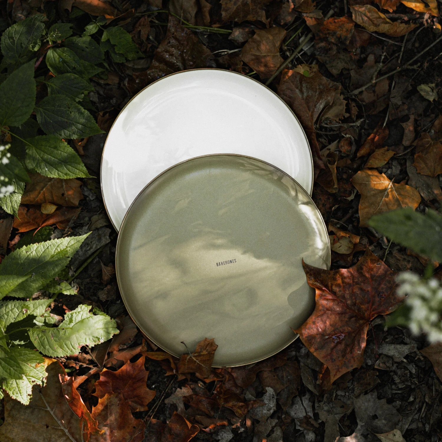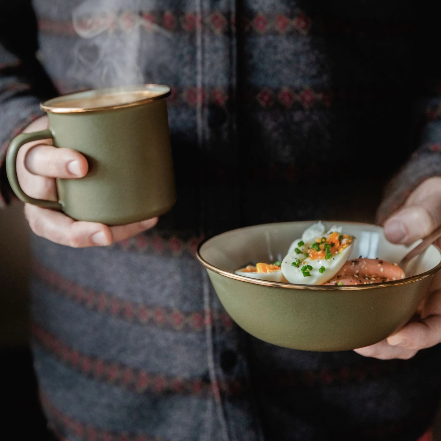 Barebones two-tone enamelware features a robust steel core, a rust-resistant enamel exterior, and a signature bronze-like stainless steel rim. The smooth, speckled white interior prevents food stains, while the matte olive drab exterior ensures superior grip and resilience.