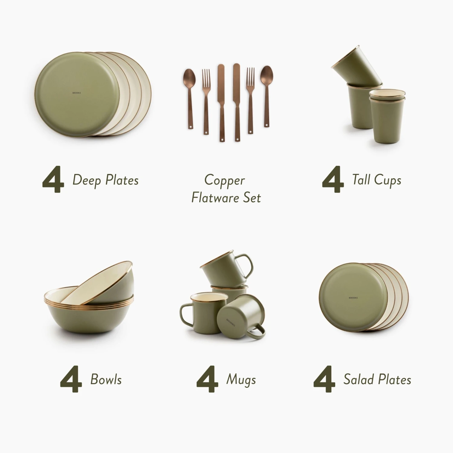 Set the scene that inspires you. The Ultimate Dining Bundle offers a full table spread of our improved 2-tone enamelware, plus the Matte copper flatware, for an extra touch of sophistication. From chic Thanksgiving gatherings to casual backyard patio hangouts or even rugged camping adventures, this set effortlessly complements every occasion with style and durability.