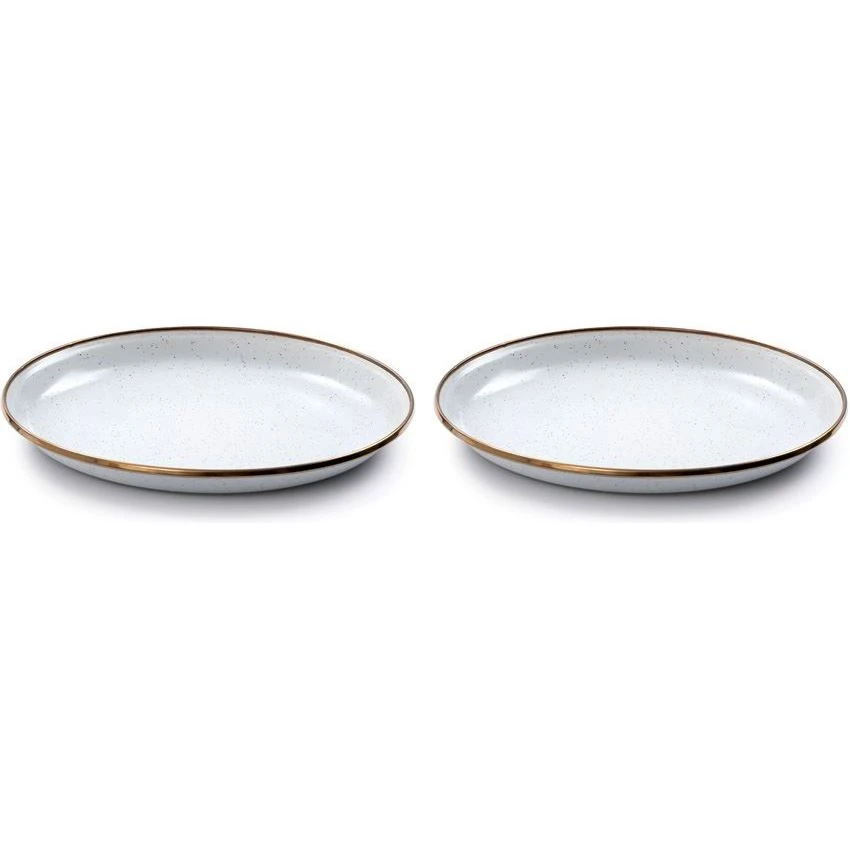 Model – BARE392. Enamel Salad Plate Set. Weight: .4lb. Set of two. Dimensions: 8 inch x 8 inch x 0.88 inch. Vintage-inspired design. Baked stainless steel rim with bronze-like patina appearance. Slight variations in color are expected. Steel core with speckled enamel finish. Raised edges. Hand wash only. Boxed with hanging tab. Made in China