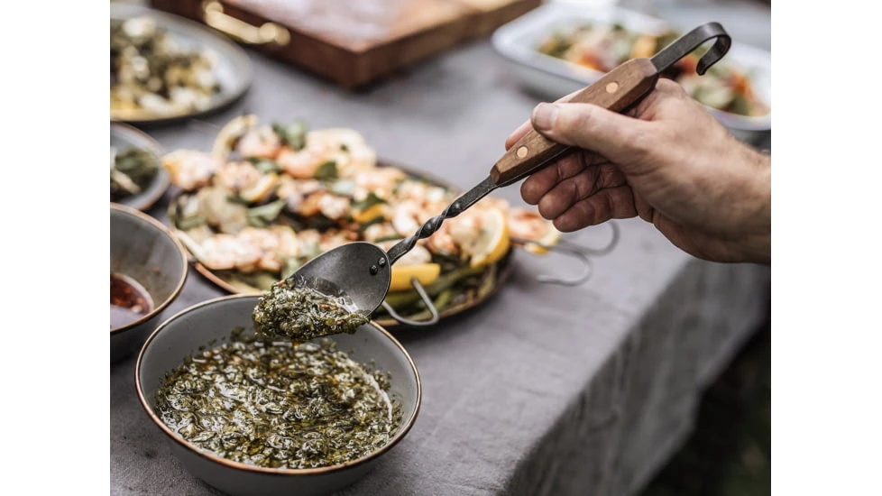 Sip, taste, and stir with this classic chef spoon. Designed to hang and work with our Cowboy Fire Pit Grill, the Cowboy Grill Chef Spoon is crafted with hand-forged stainless steel and fitted with a smooth, natural walnut handle that keeps cool over high heat. Designed for comfort and safety when working around fire and hot coals.![]()