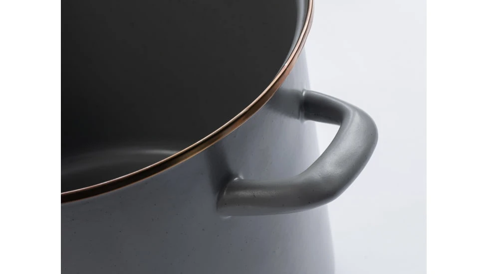 Our enamelware stainless steel rim is heat treated to create a copper-like patina finish. Both the surface and rim can be stripped of its unique coloring by acidic foods, such as lemon, and some harsh detergents and cleansers. We recommend hand washing the stock pot to protect the natural walnut wood and help maintain the original look and feel of the enamelware pieces.