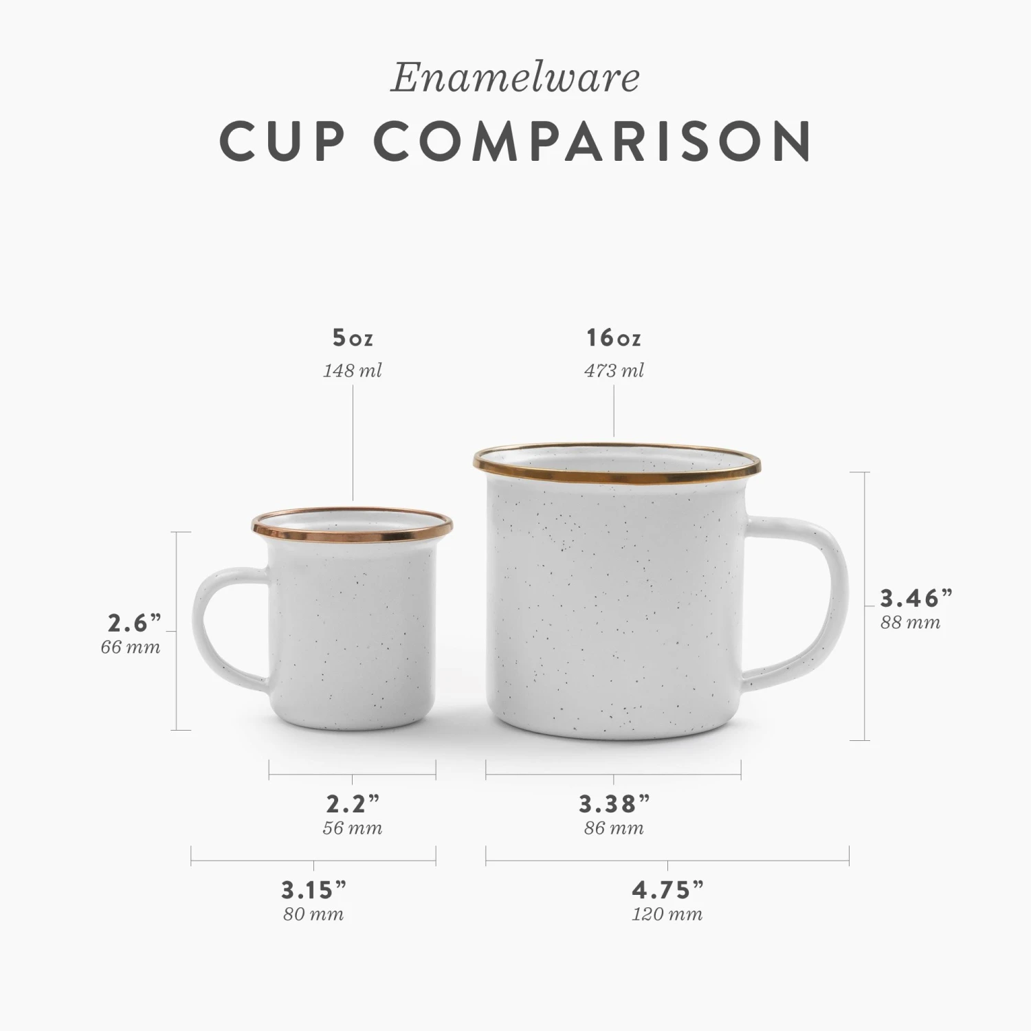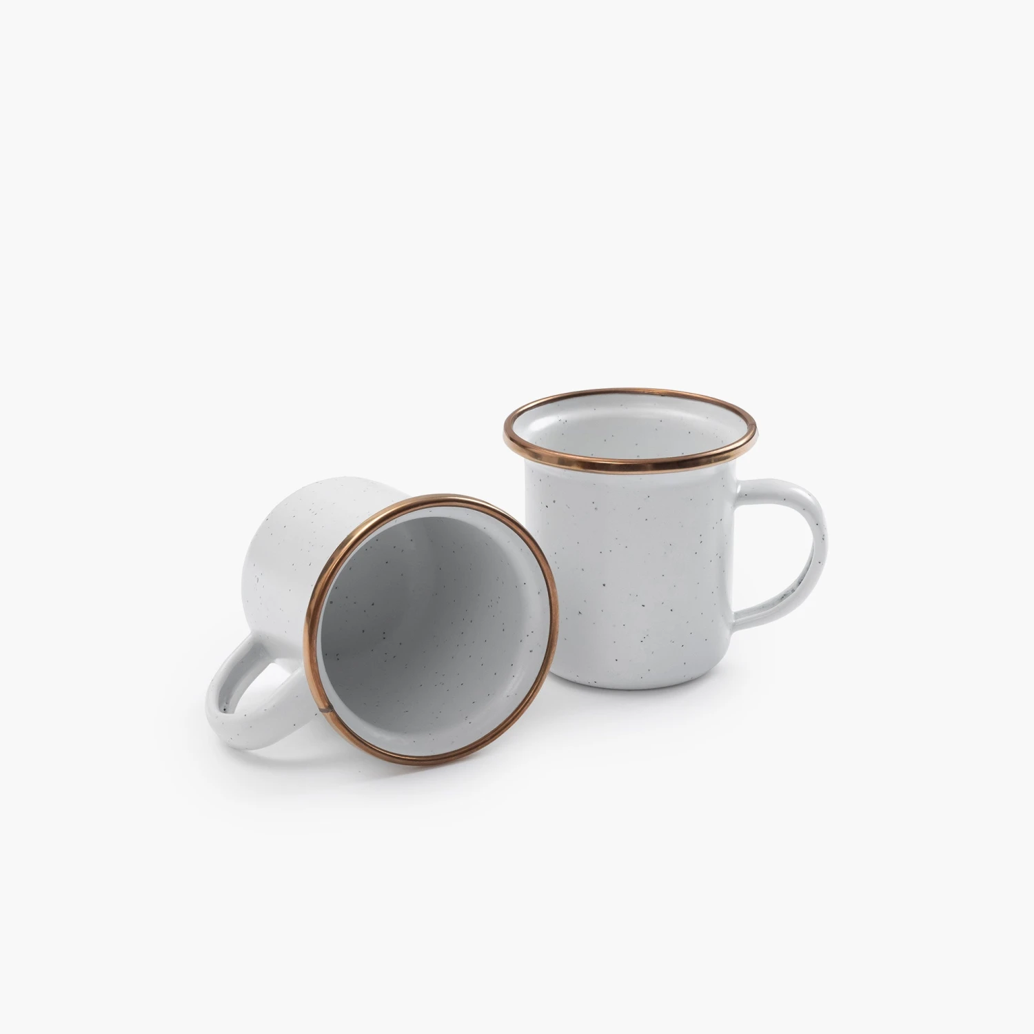 Each item features a speckled enameled surface hand-finished baked stainless steel trim creating a bronze-like patina finish, resulting in unique pieces that form a cohesive set.