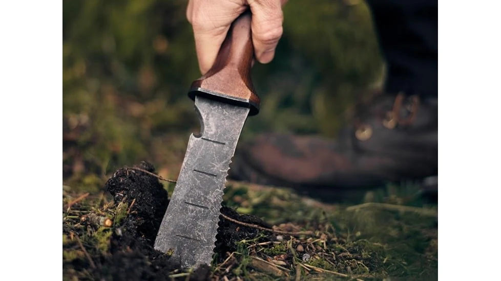 This uniquely designed multi-use tool is the perfect companion for all your outside escapades. Pound in tent stakes with the flat pommel base. Measure planting depth with the handy inch marks. Saw a branch or whittle some kindling with the rust-resistant, double-edged blade.![]()