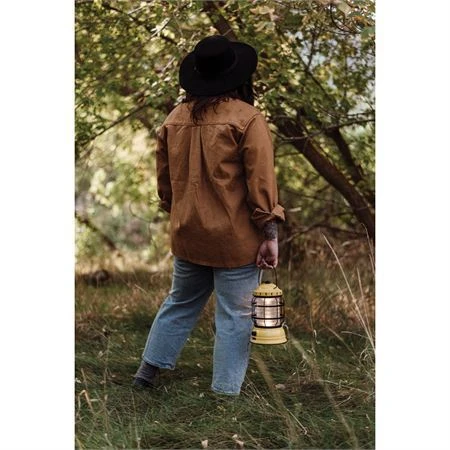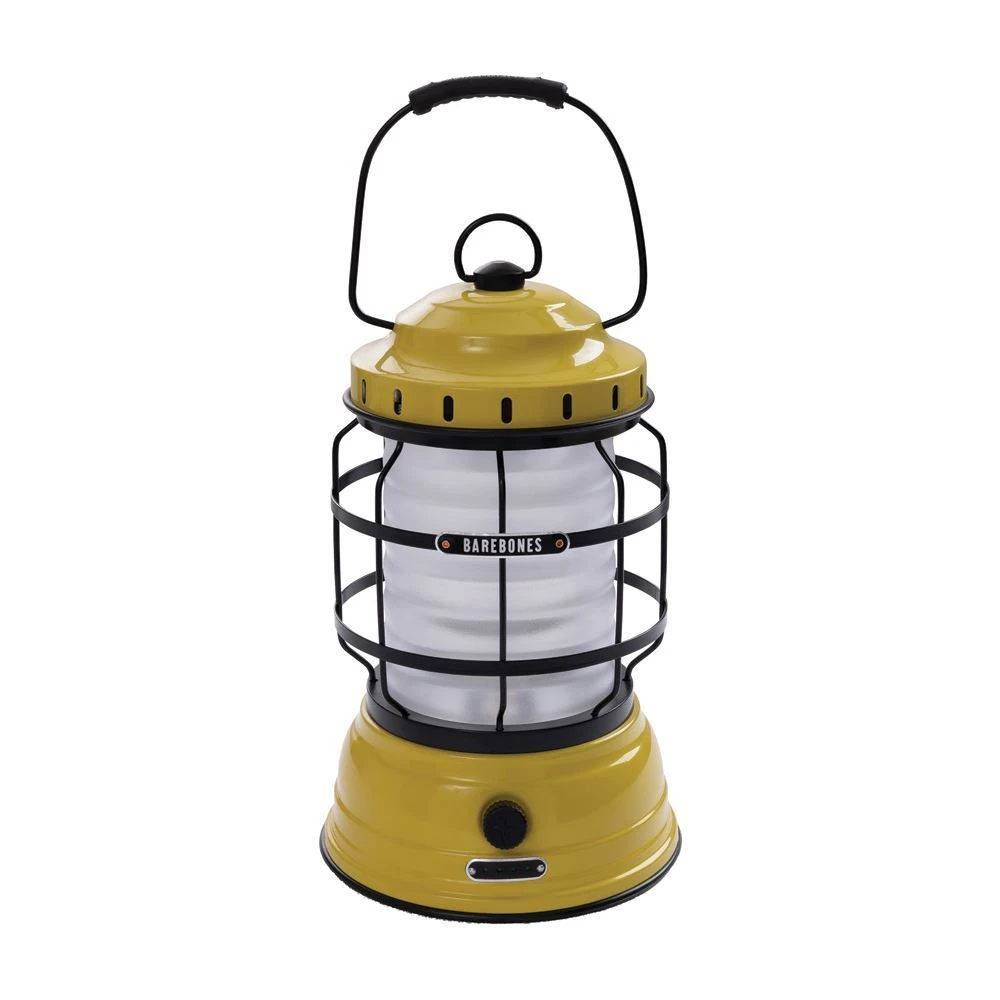 Model – BARE160. Barebones Living Forest Lantern Dusty Yellow. Dimensions: 6″ x 9.5″ x 6″. Water resistant. Impact resistant. Rechargeable. 5 Watt CREE. 220 lumens. Warm ambient LED light. 4–80 hours run time, depending on setting. Micro USB charging cord. Stamped steel, plastic, and rubber construction. Requires (2) 18650 batteries (included). Color: Yellow. Boxed. Made in China.