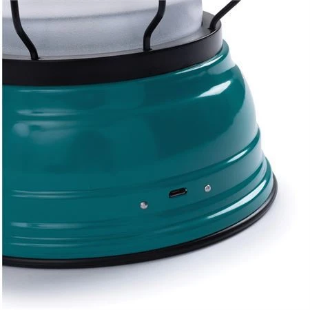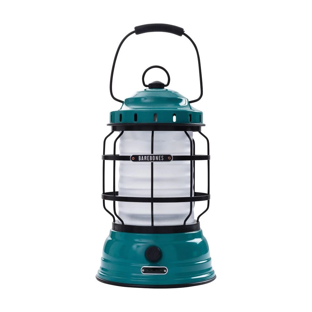 Model – BARE161. Barebones Living Forest Lantern Teal. Dimensions: 6″ x 9.5″ x 6″. Water resistant. Impact resistant. Rechargeable. 5 Watt CREE. 220 lumens. Warm ambient LED light. 4–80 hours run time, depending on setting. Micro USB charging cord. Stamped steel, plastic, and rubber construction. Color: Teal. Requires (2) 18650 batteries (included). Boxed. Made in China.