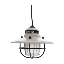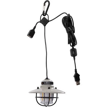 Model – BARE210. Barebones Living Edison Pendant Light. Rechargeable. Water resistant. Single light. 5V 1.6 watt warm Edison-style LED bulbs. USB charging cord. White stamped steel construction. 10′ cord with low (40 lumens); high (250 lumens) settings. Three carabiners for hanging. Boxed with hanging tab. Made in China.