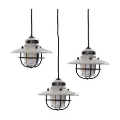 Model – BARE215. Barebones Living Edison String Lights. Rechargeable. Water resistant. Set of three. 5V 1.6 watt warm Edison-style LED bulbs. USB charging cord. White stamped steel construction. 10′ cord with low (40 lumens); high (250 lumens) settings. Three carabiners for hanging. Boxed. Made in China.