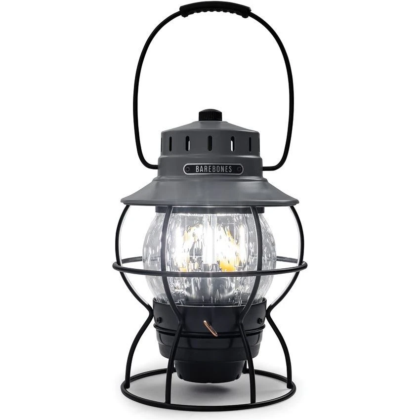 Model – BARE282. Railroad Lantern Slate Gray. Dimensions: 5.85 inch x 5.85 inch x 12.81 inch. Water resistant. Impact resistant. Weight: 1.9lb. Vintage railroad lantern inspired design with unique steel cage and seeded glass globe. Stamped steel construction. Adjustable brightness warm Edison-style LED bulb. Carry handle. Modes: High (200 lumens, 3.5h runtime); Low (35 lumens, 100h runtime). USB-C cable. Built-in charger. Requires (2) 18650 batteries (not included). Color: Gray. Boxed. Made in China.