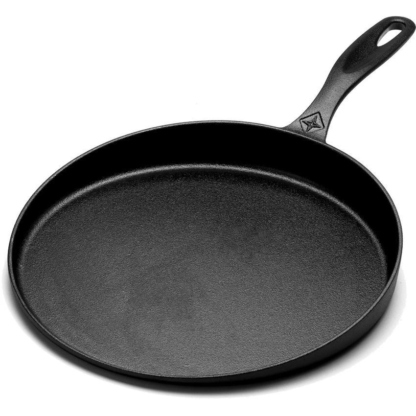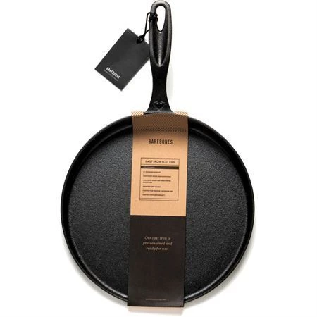 Model – BARE314. Cast Iron Flat Pan. Dimensions: 12 inch x 12 inch x 3 inch. Weight: 7lb. 12 inch pre-seasoned cast iron cooking surface. Open sides and high back. Comfort grip handle. Indoor/outdoor use. Seasoned with sunflower oil. Boxed. Made in China