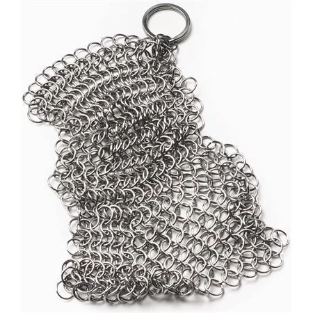 Model – BARE330. Stainless Cleaning Mesh. Dimensions: 6 inch x 6 inch. Care for your cast iron with this gentle but effective cleaning tool that wonÕt scratch or scar your cookware. Built to last through years of frequent use. Removes cooked-on foods, sauces, syrups, and gravies with ease, returning your cast iron pieces to their natural beauty. Use with glass, porcelain, steel, copper, and aluminum cookware as well. Stainless construction. Made in China