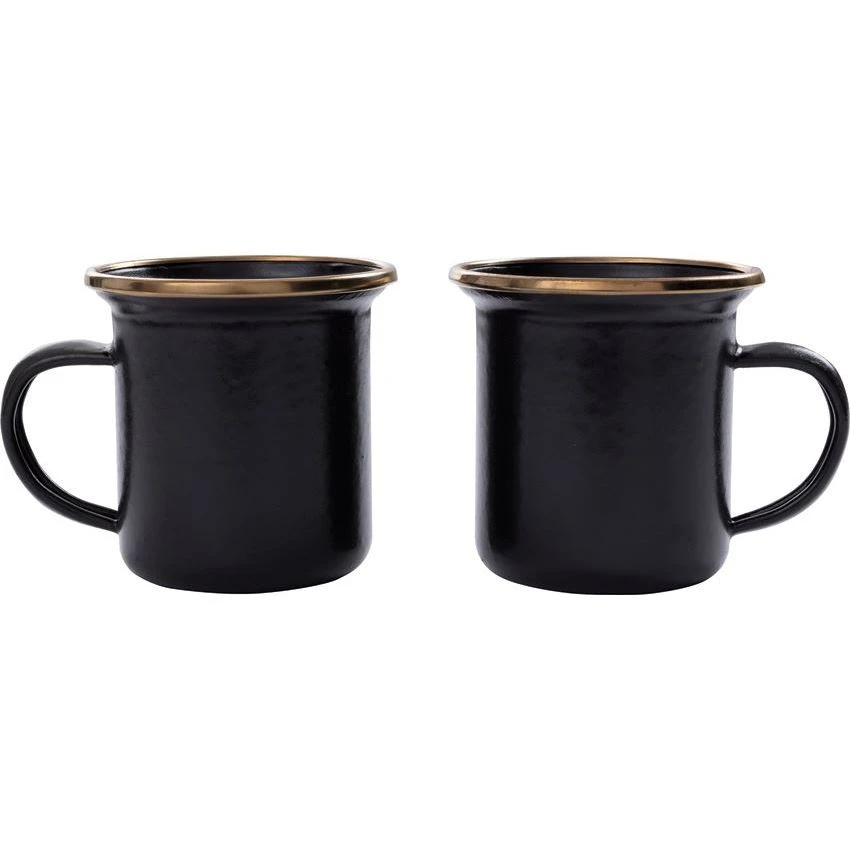 Model – BARE344. Barebones Living Enamel Espresso Cup Set. Dimensions: 5″ x 3.75″ x 3.5″. Set of two. Hand-finished baked stainless trim creating a copper-like patina finish. Steel core with charcoal enamel finish. Vintage-inspired design. Slight variations in color on rim are expected. Boxed. Made in China.