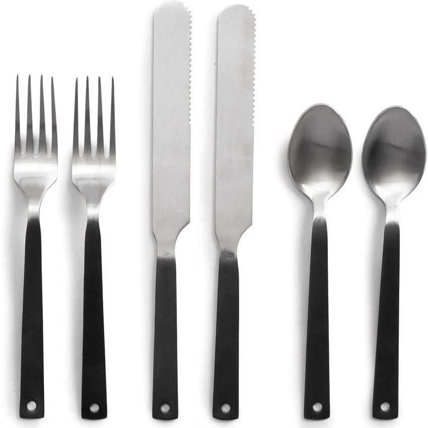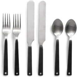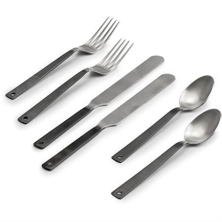 Model – BARE360. Flatware Set. 7.75 inch overall. Dishwasher safe. Includes: (2) forks; (2) knives; (2) spoons; cable loop; storage bag. Steel core with gray enamel finish and black handle design. Indoor or outdoor use. Stainless construction. Bulk packed.