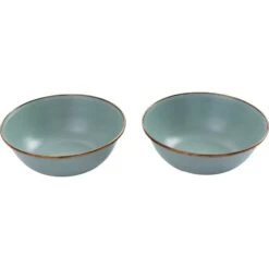 Model – BARE425. Barebones Living Enamel Bowl Set. Dishwasher safe. Set of two. 6″ diameter. Indoor or outdoor use. Vintage-inspired design. Steel core construction with green enamel finish and antique copper-like detailing. Boxed with hanging tab. Made in China.