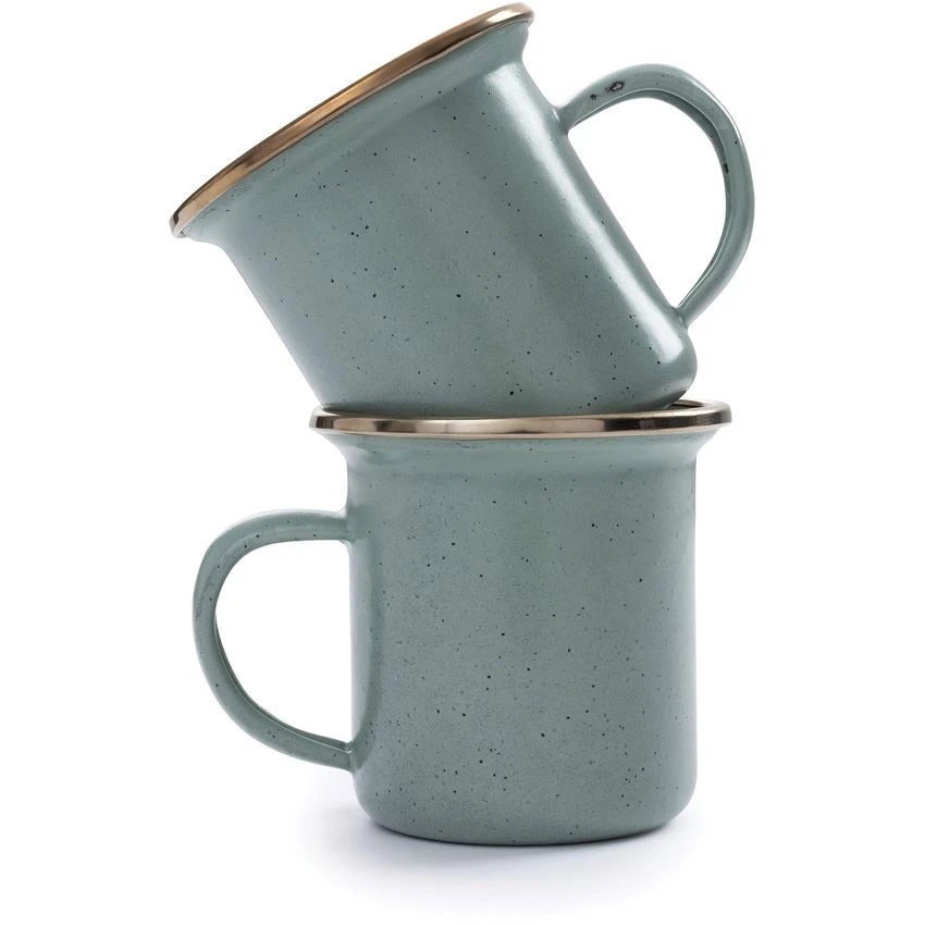 Model/Part Number – BARE429. Barebones Living Enamel Espresso Cup Set. Dimensions: 5″ x 3.75″ x 3.5″. Set of two. Hand-finished baked stainless trim creating a copper-like patina finish. Steel core with speckled enamel finish. Vintage-inspired design. Slight variations in color on rim are expected. Color: Mint. Made in China.