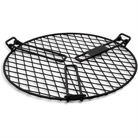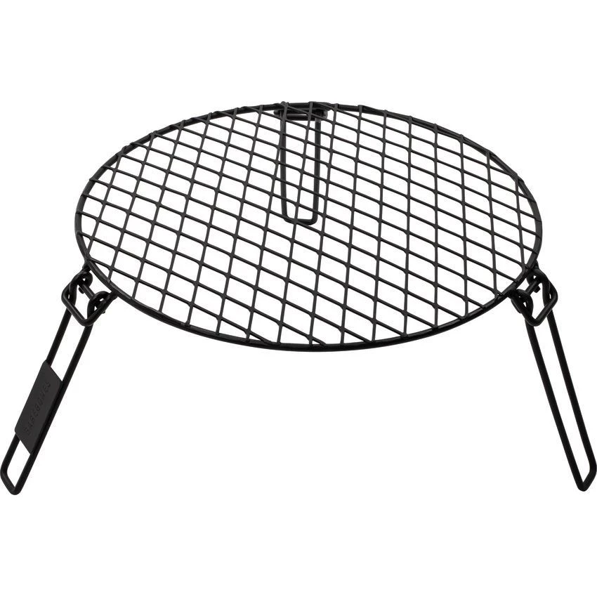 Model – BARE477. Fire Pit Grill Grate Circular. Dimensions: 16.5 inch x 16.5 inch x 7.25 inch. Q235 steel mesh grill and frame. High temperature black coating. Three 8 inch legs. 7 inch ground clearance. Steel construction. Boxed. Made in China