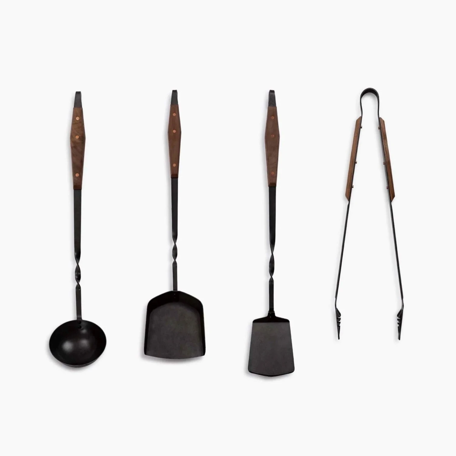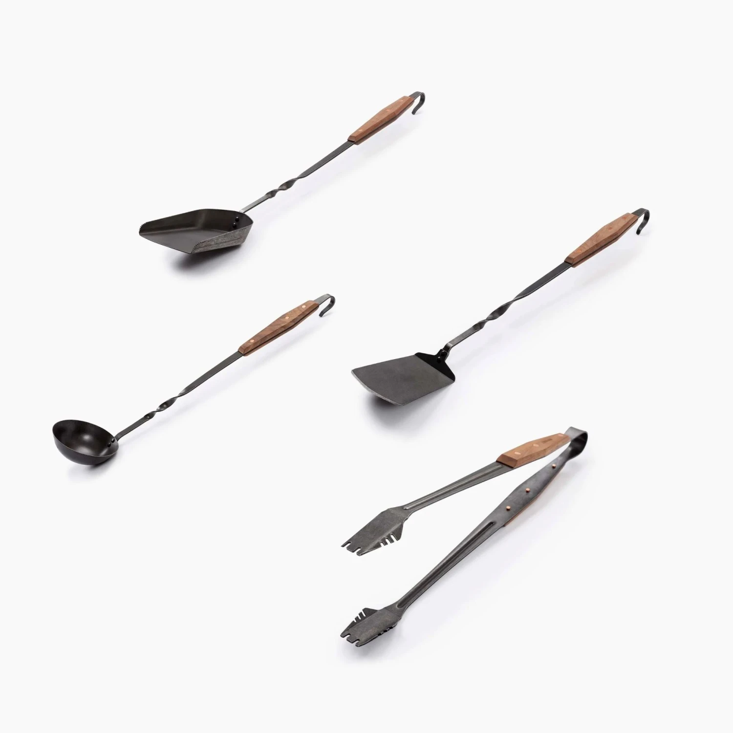 Intentionally designed to hang and work with our Cowboy Fire Pit Grill, These four tools are crafted with hand-forged stainless steel and fitted with a smooth, natural walnut handle that keeps them cool over high heat. Longer than average length allows for comfort and safety when working around fire and hot coals.
