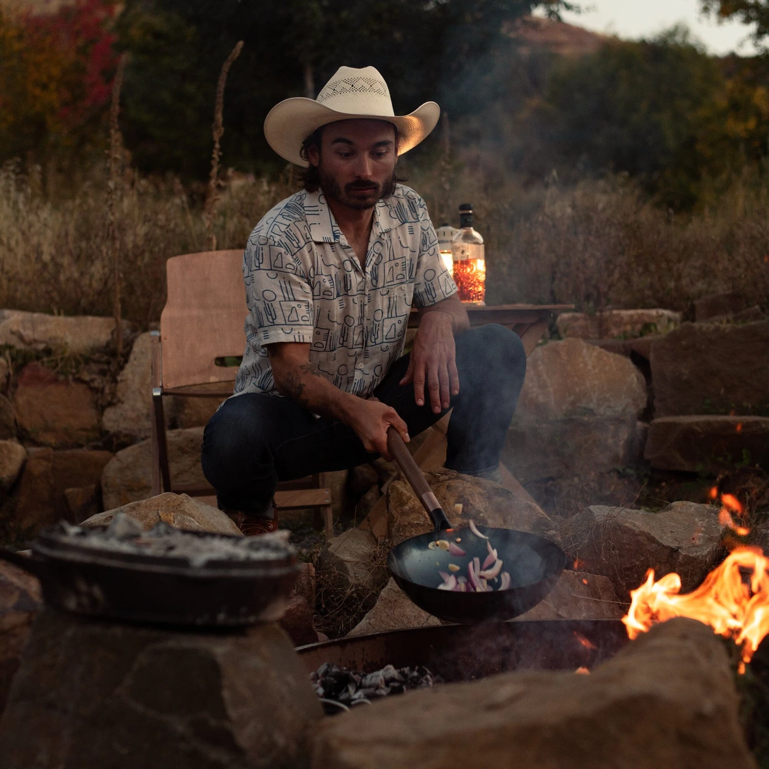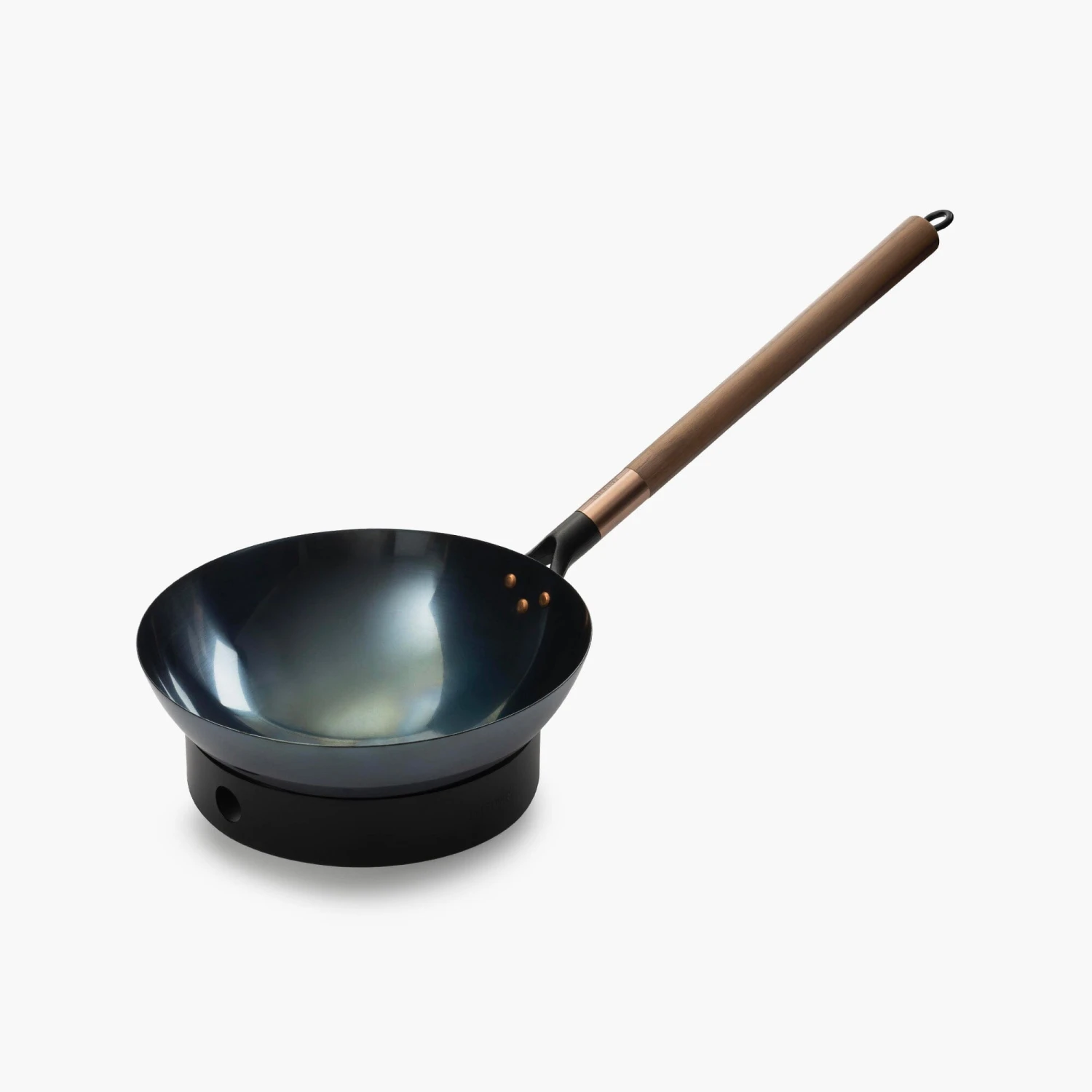 Need to multitask? The hand-blued steel ring base allows the wok to be left in an ideal cooking position without constantly holding the handle. Set it on the gas stovetop or fire while you finish your meal prep. Briquettes can also be placed inside the ring for an instant grill on the go. A versatile and travel-friendly addition to your camp or kitchen collection.