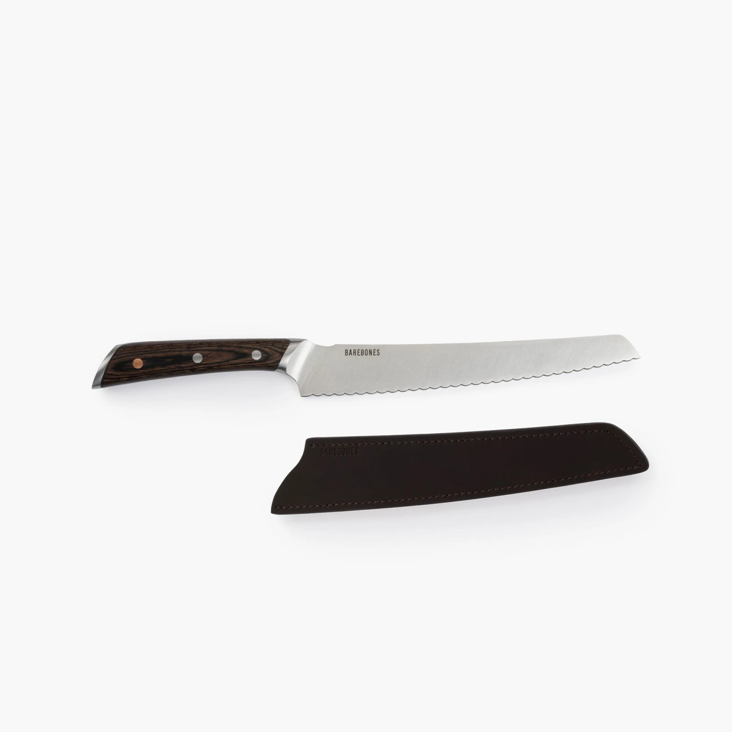 Once you own a bread knife, you never go back. This 14″ thin blade has sharp, serrated edges that effortlessly slice through bagels, cakes, and baguettes. Unlike a standard serrated knife, the extended length cuts accurately through thick baked goods: Bake or purchase a fresh loaf of bread and cut the slices to your preferred thickness. This bread knife also functions as an excellent all-around deli knife for thinly sliced meats.