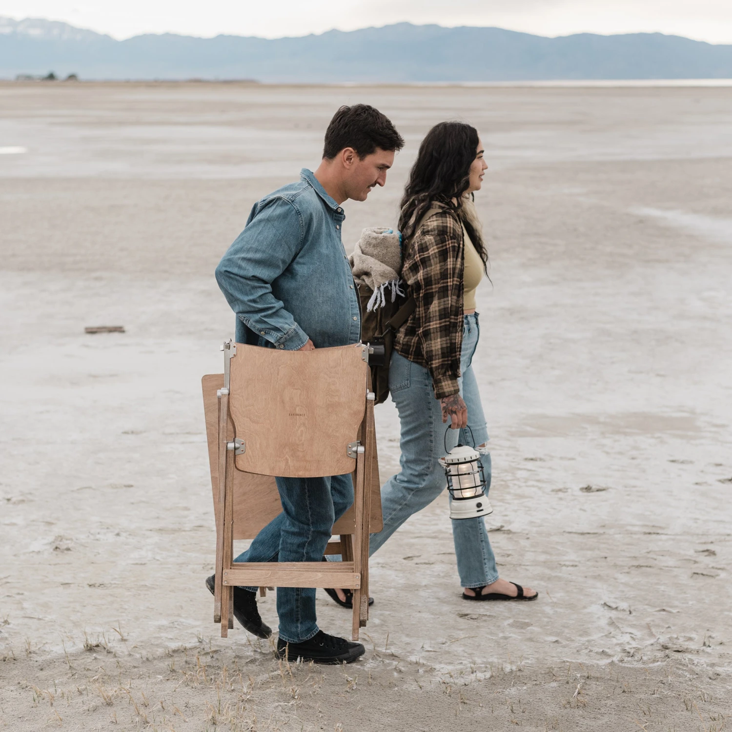 Inspired by antique school and church folding chairs historically used indoors, this wooden folding chair is reimagined for outdoor use. Unique and portable, the Ridgetop is ideal for use as part of an urban patio set, in a backyard, camping/glamping, or as extra seating during a large dinner party. Hardwood birch, stainless steel, and copper details come together to create a seamless and natural aesthetic that blends into any outdoor scene. Sturdy and built to last, this chair folds down easily: store it when not in use or pack it in an RV or car. The Ridgetop Folding Chair is stained with a lovely natural honey color and finished with a weatherproof satin clear coat. Seat is slightly curved, smooth, and shaped for comfort. A unique camp and backyard accessory that’s quality enough to use indoors when extra room is needed.