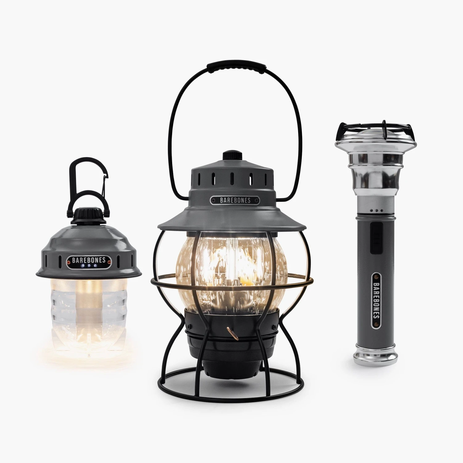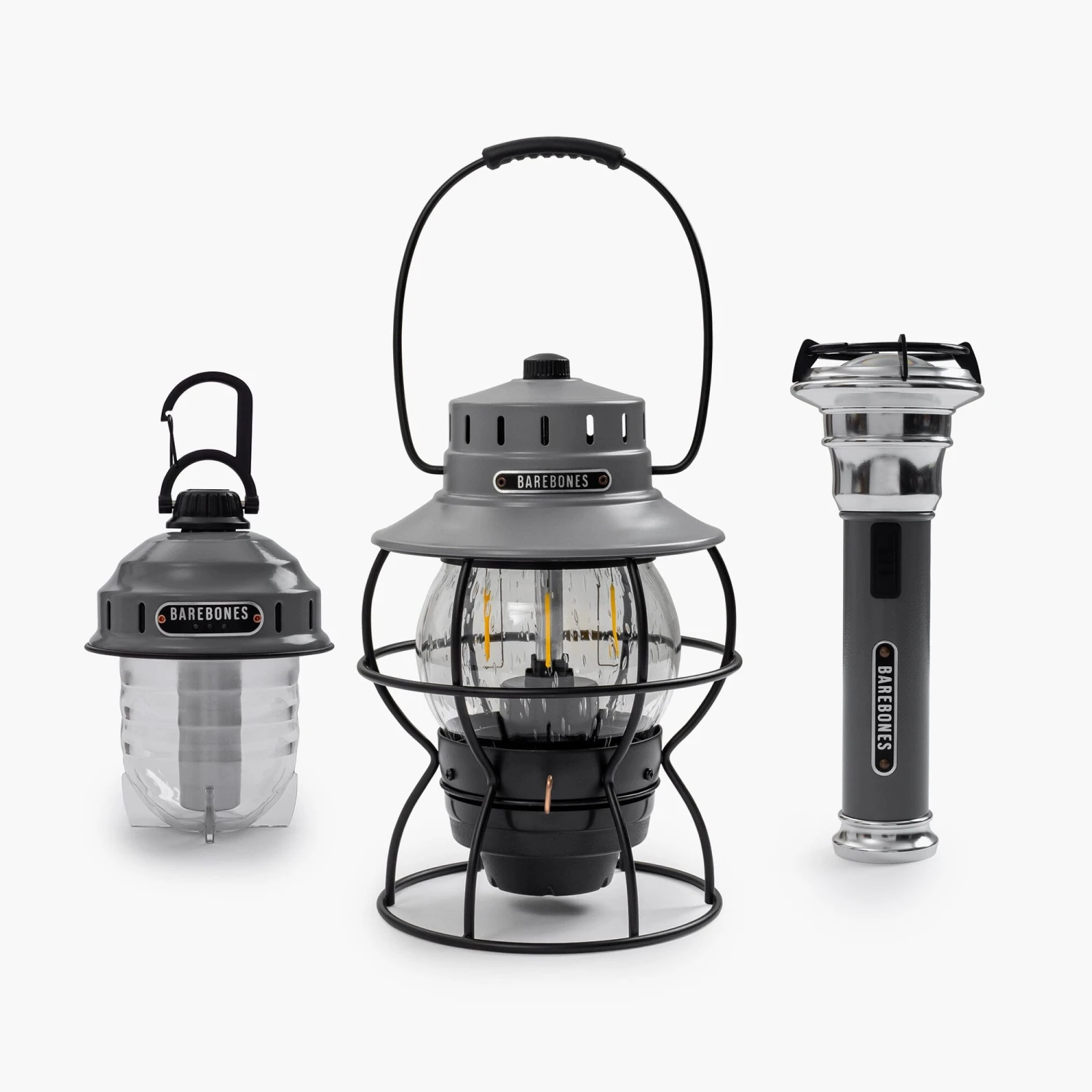 The Barebones Outdoor Lighting Trio features three distinct rechargeable lights that are as versatile and reliable as they are attractive.